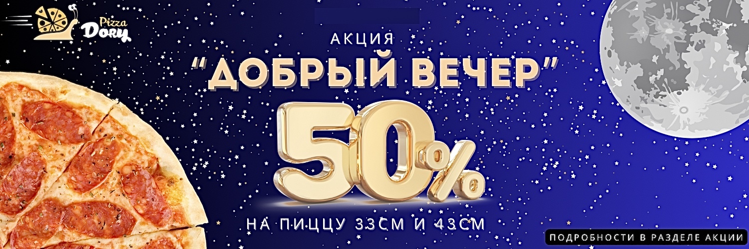 С понедельника по четверг с 21:00 до 22:00 в пиццерии действует скидка 50% на целую пиццу 43см и 33см.