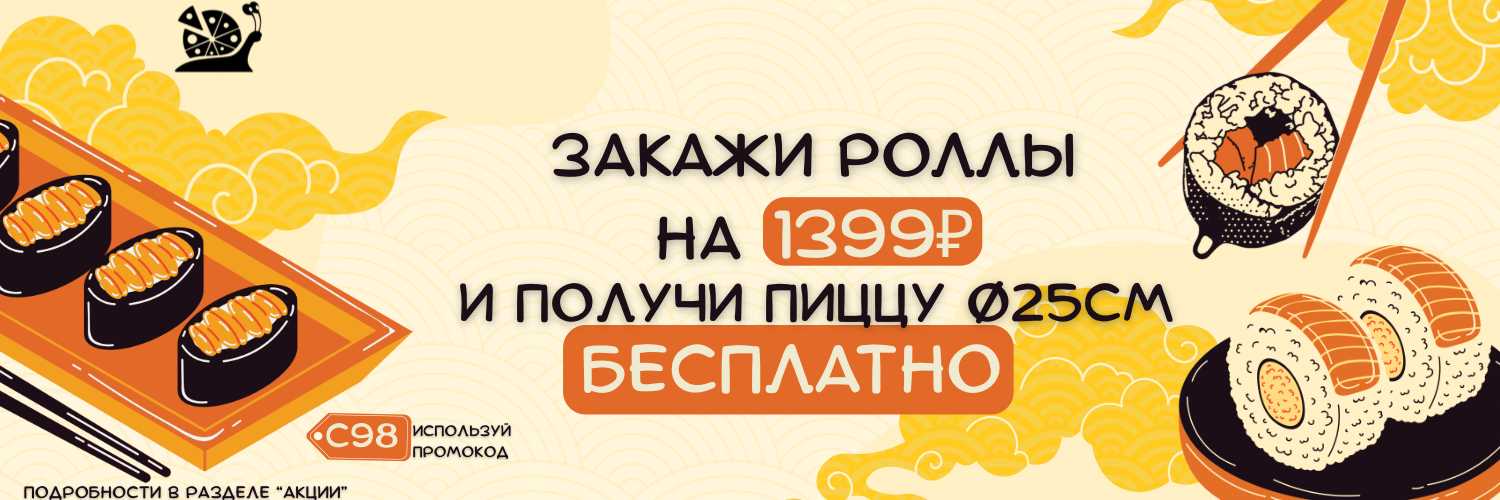 Совершая заказ роллов в зале на сумму от 1399₽ пиццу Ø 25 см Вы получаете БЕСПЛАТНО!